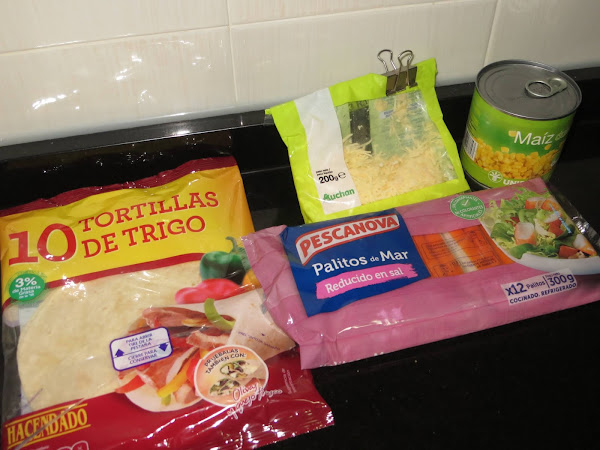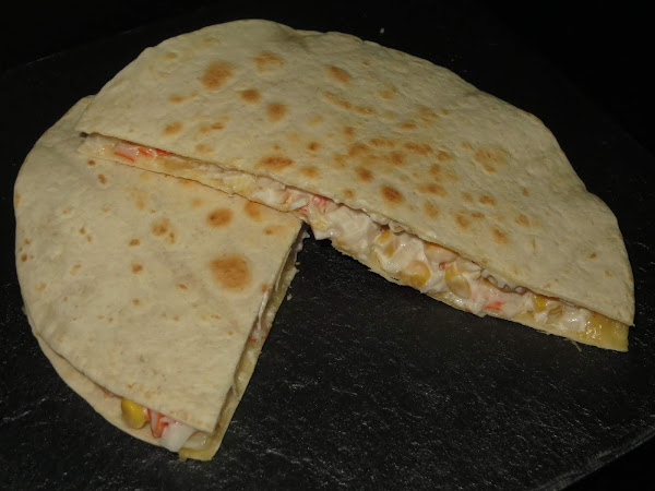 Picamos muy finito el surimi o compráis surimi rallado, lo mezcláis con el maíz y el queso crema. Ahora colocáis una tortilla de trigo en una sartén grande o plancha, echáis los puñados de queso rallado y el relleno por encima. Tapáis y cuando ya está el queso derretido le dais la vuelta para que se haga por el otro lado y ya está lista para servir.