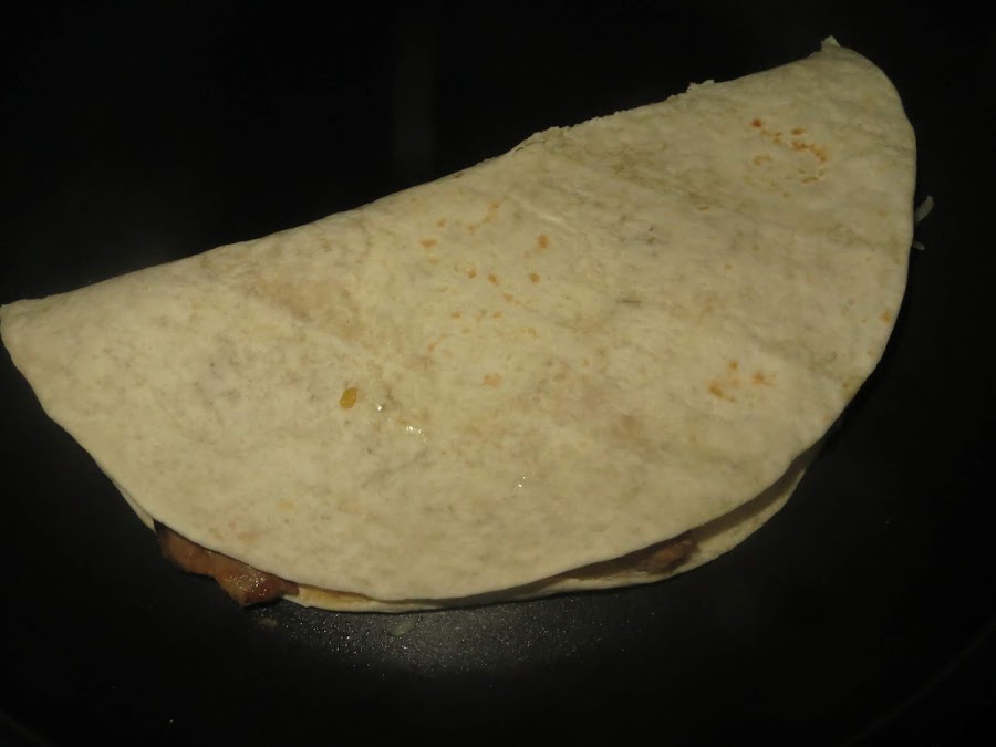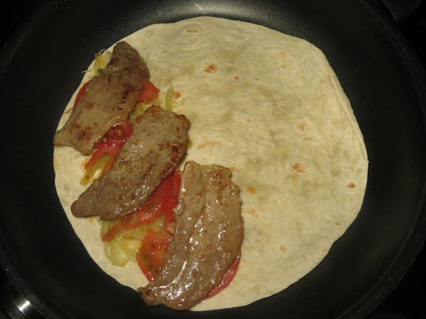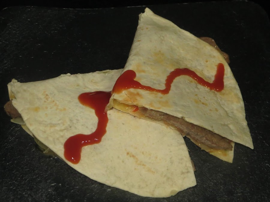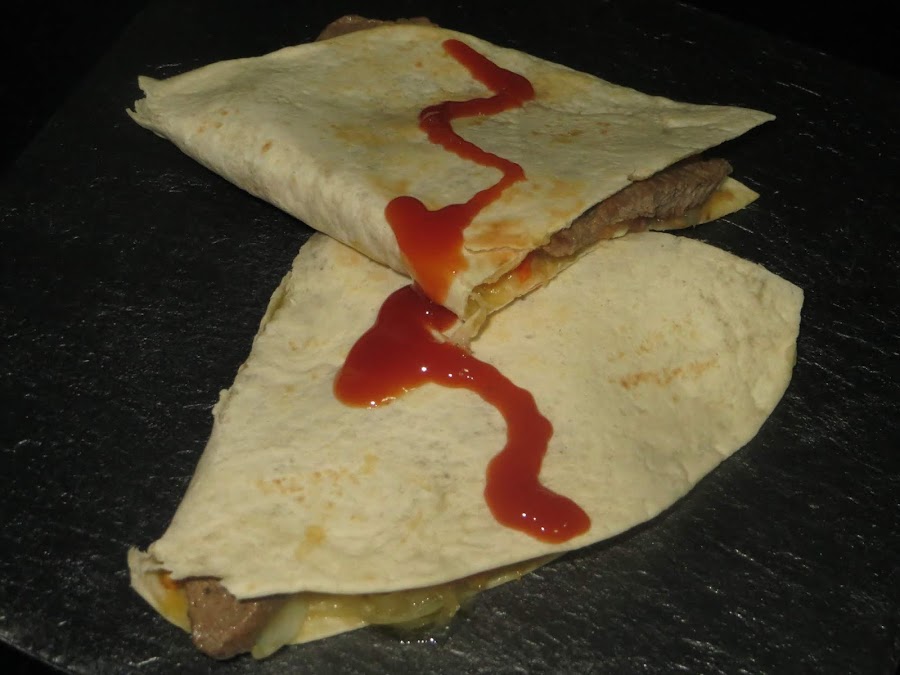 Ahora llega el momento de montar nuestra quesadilla, colocamos una tortilla de trigo y en una mitad de la base colocamos la cebolla, luego el tomate cortado en rodajas finas, los filetes de ternera y finalmente los quesos rallados. Tapamos con la misma tortilla, es decir la doblamos y le vamos dado vueltas hasta que el queso esté derretido y la tortilla un poco dorada.