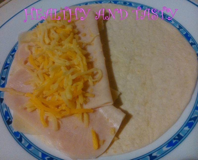Esta receta es muy sencilla. Ponemos en una tortita de trigo una loncha de queso, que cubra sólo la mitad. Encima colocamos 3 lonchas de york o pavo y cubrimos con queso rallado.