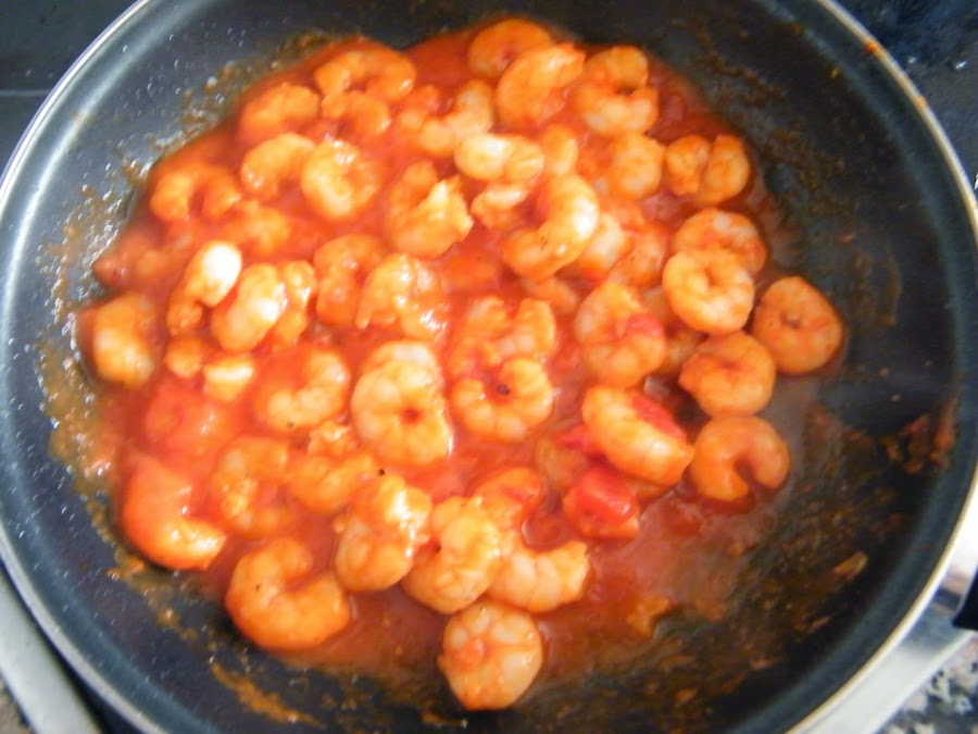 2. Calentamos en una sartén una cucharadita de aceite de oliva y salteamos las gambas salpimentadas durante 3 minutos. Si utilizáis gambas congeladas, deshaceos de todo el agua que suelten. Entonces añadimos el tomate, la harissa y un chorro de lima y dejamos cocer a fuego medio-alto durante 2-3 minutos más, hasta que el color y la textura indiquen que las gambas están listas. Reservamos.