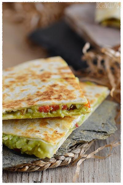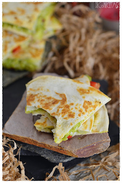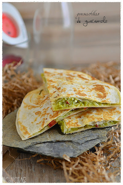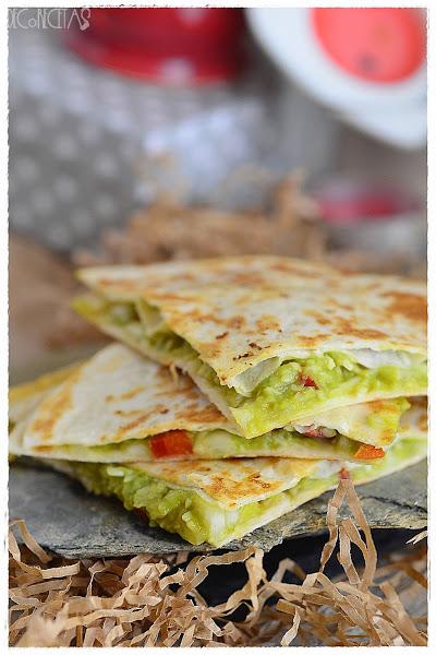 Puede parecer que así el guacamole no está bueno, pero para mi gusto, más rico todavía. Además, lo juntamos para el relleno de estas quesadillas con queso, pimiento rojo y cebolla, y os podéis imaginar, no?