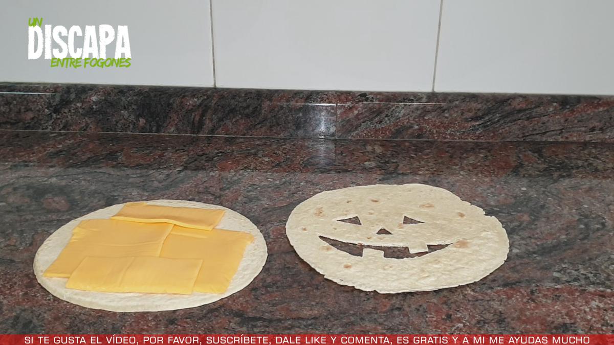 1Aquí tengo las típicas tortillas de maíz, tipicas de México. Y aquí tengo una plantilla de una calabaza de halloween. Colocamos la plantilla sobre la tortilla de maíz y con la ayuda de un cuchillo bien afilado vamos recortando los ojos, la nariz y la boca. Yo e utilizado 2 plantillas distintas.