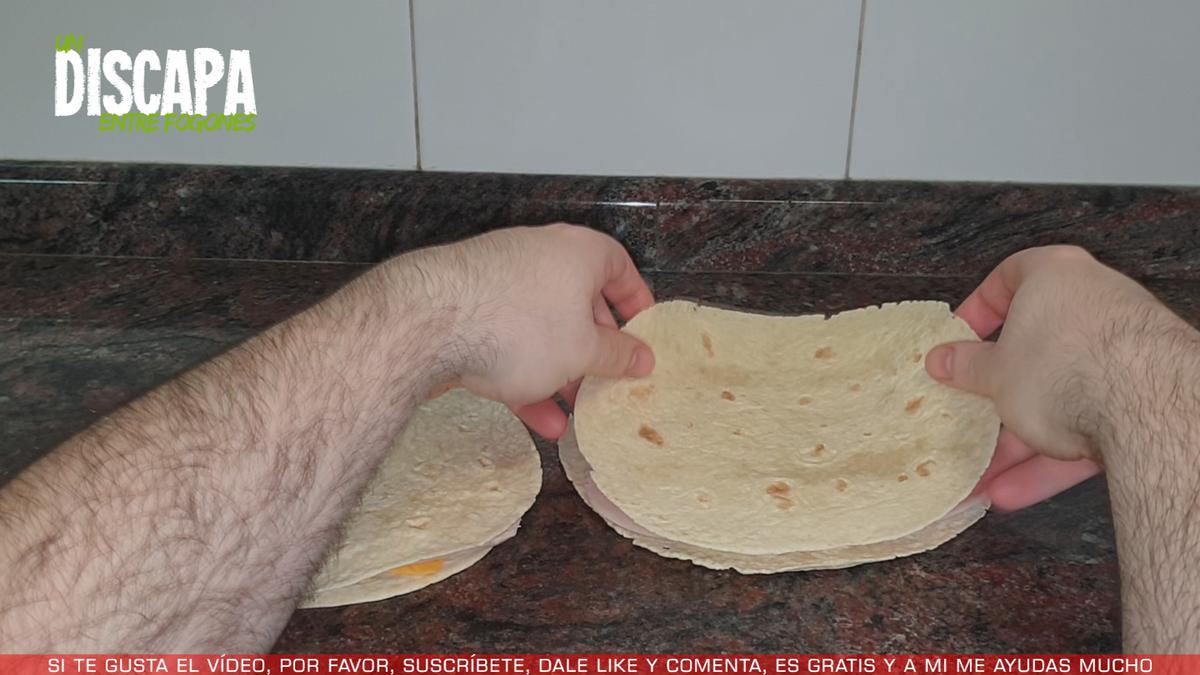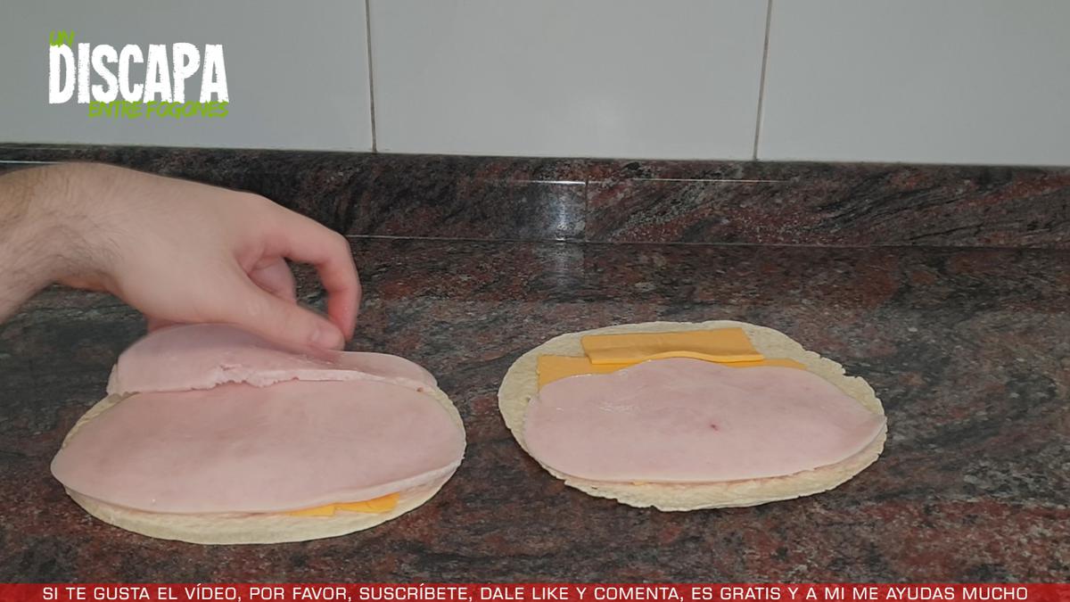 3Aquí tengo unas lonchas gorditas de pavo, las colocamos sobre el queso cheddar, procurando que quede lo mejor repartido posible.