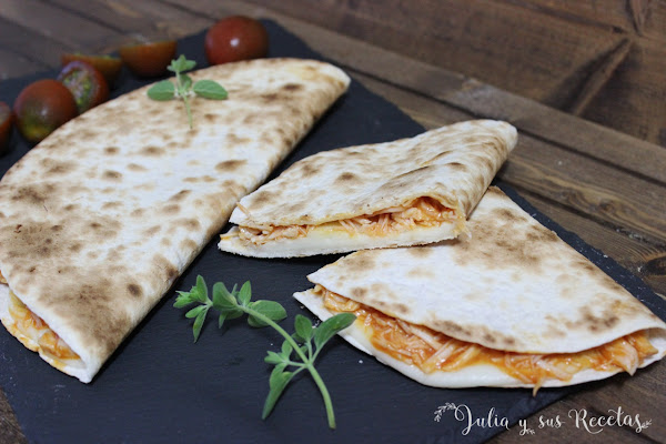 Las quesadillas son un plato Mexicano que consiste en una tortita de trigo o de maíz, doblada y rellena de queso fundido y que puede ir acompañada de otros ingredientes, como en esta ocasión, carne de pollo y tomate frito.