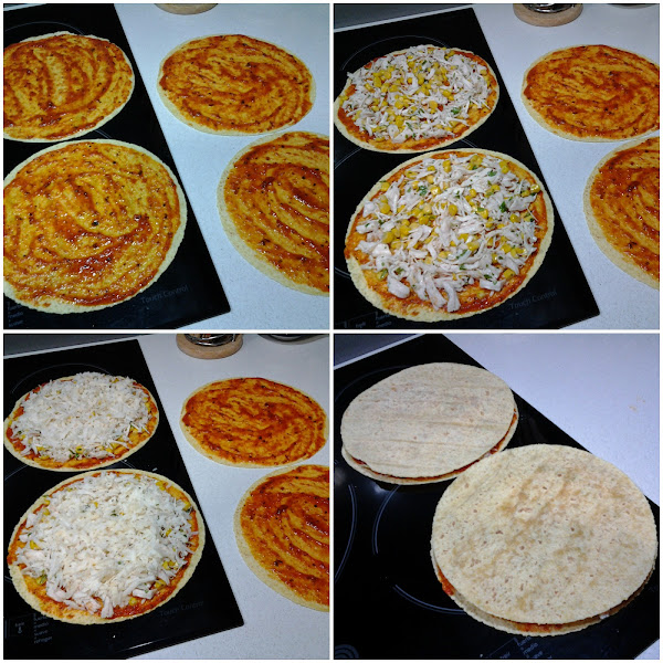 Cogemos una tortita, untamos con el tomate toda la superficie. Colocamos la mezcla de pollo y espolvoreamos con el queso rallado. Cubrimos con la otra tortita untada con tomate y presionamos un poco.