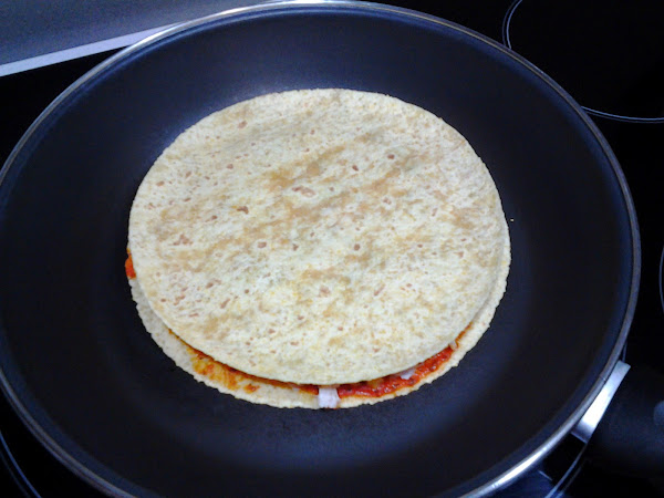 Calentamos una sartén y colocamos la quesadilla en ella para que se tueste la superficie 2 minutos por cada lado. Una vez listo, las llevamos al horno precalentado a 220º durante 5 minutos para que el queso se derrita.