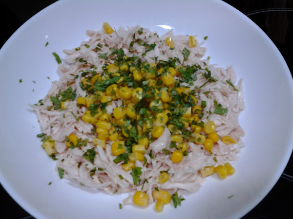 En un bol ponemos la pechuga de pollo desmenuzada junto al maíz, el cilantro picadito y mezclamos.