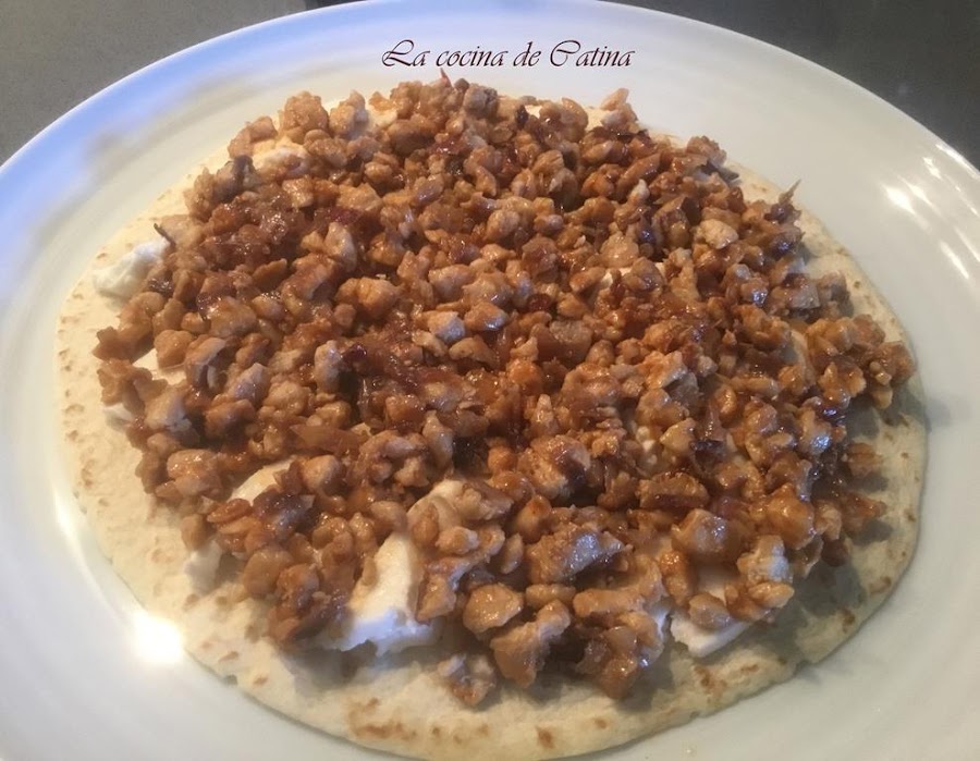 En el plato que vayamos a servirlo, ponemos una tortilla y la cubrimos con mozzarella cortada en lonchas, mezcla de pollo y perejil y el queso cheddar.