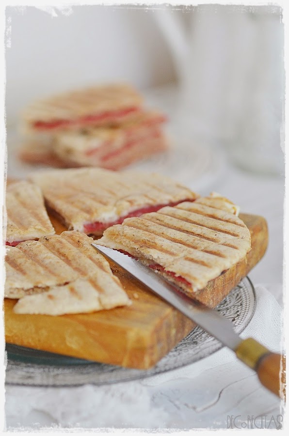 Rellenamos el pan de pita con unas lonchas de salami y queso para fundir, y a la plancha caliente! el queso se funde, el salami se calienta y el pan...crujiente!! No hay cosa más rica!