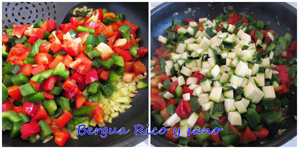 2. Cuando la cebolla esté tierna, añadimos el pimiento rojo y el verde lavados, troceados a daditos y sin semillas. Tapamos para que se cocine más rápido con ayuda del vapor y les damos unos 4 minutos a fuego medio-alto para que se ablanden un poco.