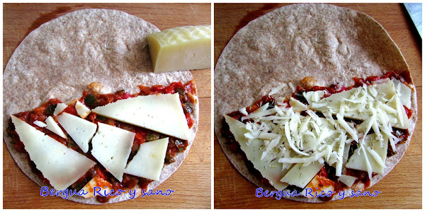 6. Ahora tomamos una tortilla, cubrimos la mitad con pisto y sobre éste distribuimos trozos de queso manchego. Espolvoreamos con el romero seco. No hace falta nada más, pero si tenemos un puñadito de queso rallado de sabor suave, nos servirá de "pegamento" cuando se funda; es opcional. Doblamos sobre la parte donde tenemos los ingredientes.