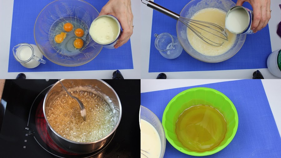 Primero hacemos el caramelo. Ponemos el azúcar y el agua al fuego y dejamos que hierva hasta formar un caramelo dorado, pero no demasiado. Lo echamos en el molde y cubrimos el fondo y las paredes.