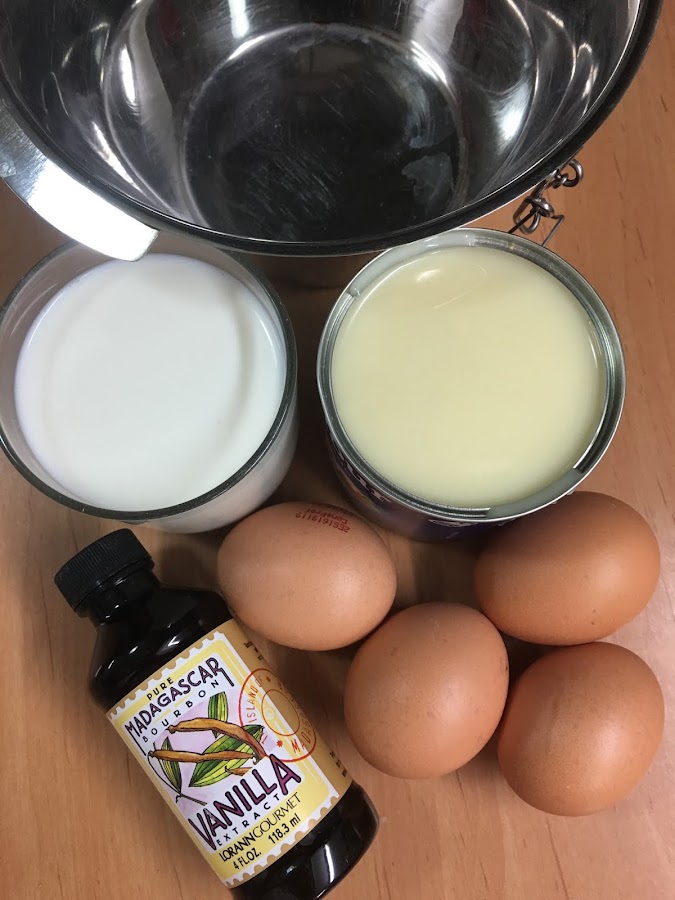 Se prepara la mezcla poniendo en un recipiente para batir, la leche condensada, los huevos, la vainilla, y el bote de leche condensada usado, ahora lleno de leche.