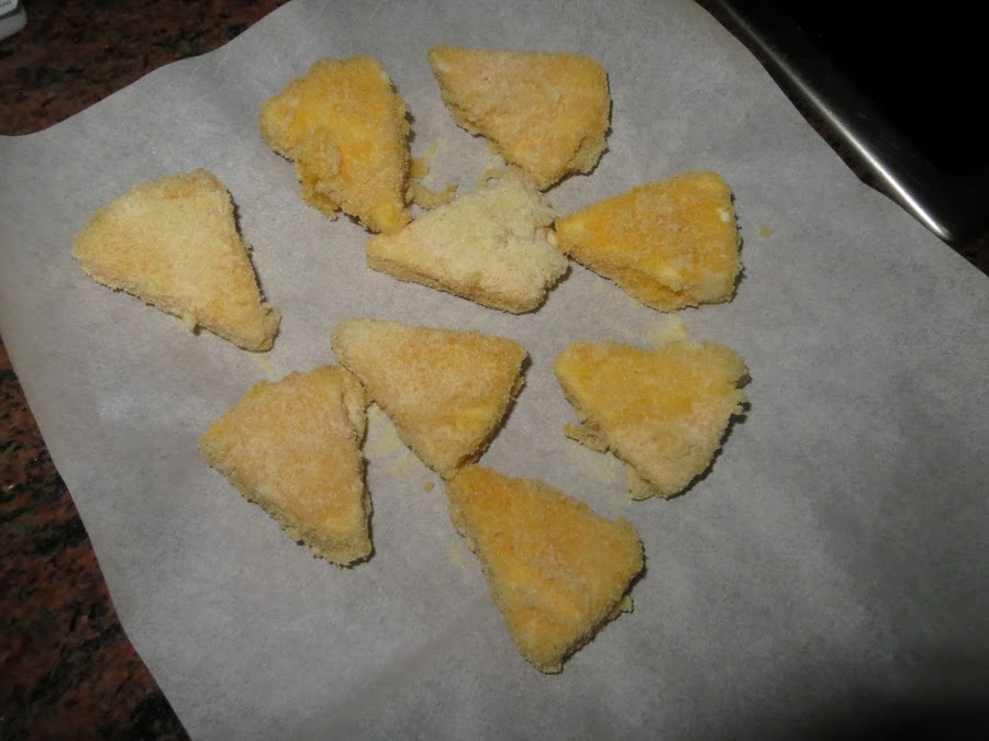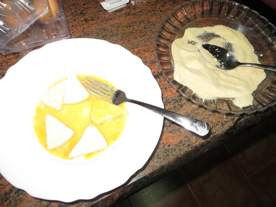 Esta receta es muy sencilla, pero os voy a dar unos pequeños trucos para que os quede mucho mejor. Lo primero que hacemos es preparar el rebozado, un plato con huevo batido y otro con pan rallado, podéis añadirle ajo en polvo, perejil, aunque yo preferí dejar nada más el pan rallado. Ahora sacáis los quesitos del frigorífico y os rebozáis de la siguiente manera: una capa de pan rallado, otra de huevo y otra de pan rallado.