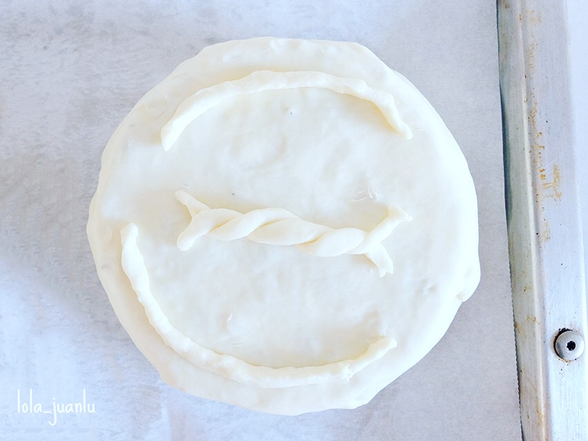 Le damos la vuelta, de manera que quede el lado liso hacia arriba y en el que están los pliegues hacia abajo, y decoramos con la masa que nos ha sobrado.