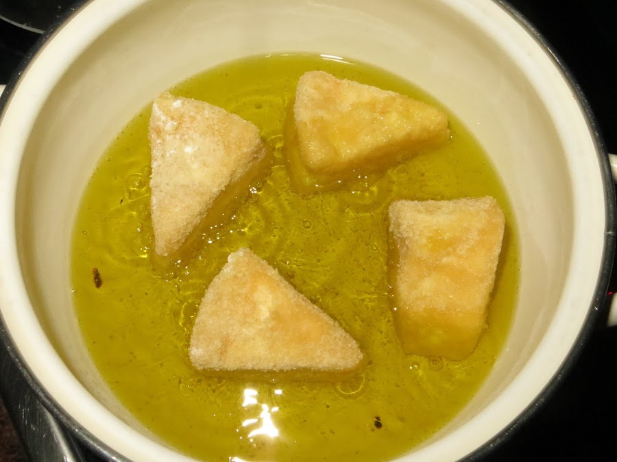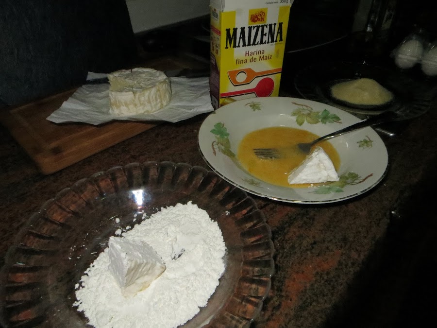 Ponemos los diferentes trozos en papel albal y lo metemos al congelador durante 30 minutos para que así al freírlo el queso no se salga, aunque con el doble rebozado es más difícil. Ponemos una cacerola con aceite de oliva en el fuego y cuando veamos que el aceite está caliente ponemos en dos tandas los trozos de queso, le damos varias vueltas para que se fría por ambos lados, sacamos a un papel absorbente para quitarle el exceso de aceite y ya está listo para comer. Se puede acompañar con mermelada, aunque si me dejáis haceros una sugerencia yo lo probé con guacamole y está de escándalo.