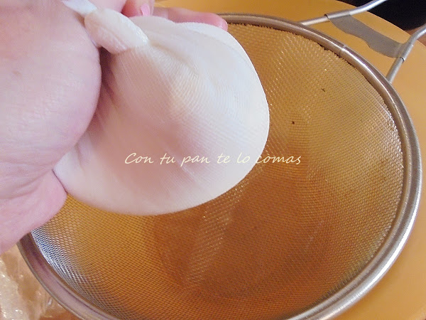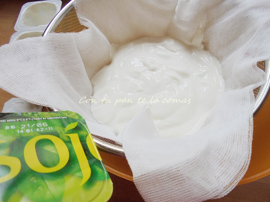 2. Vacía 4 yogures de soja en la gasa, tapa todo el conjunto con papel film o similar y llévalo al frigorífico durante unas cuantas horas o toda la noche.