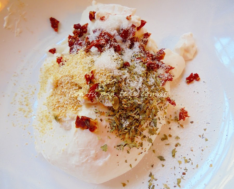 Este queso de untar se hace a partir de yogures de soja. El procedimiento es tan sencillo como dejarlos reposar durante unas horas en una gasa para que se separe el suero. Lo más cómodo es dejarlos toda la noche, que es lo que yo hago, y partir de ahí se puede condimentar al gusto de cada cual. Se pueden picar unos frutos secos, dátiles, diferentes especias, etc. En mi caso he utilizado unos tomates secos, ajo y orégano.