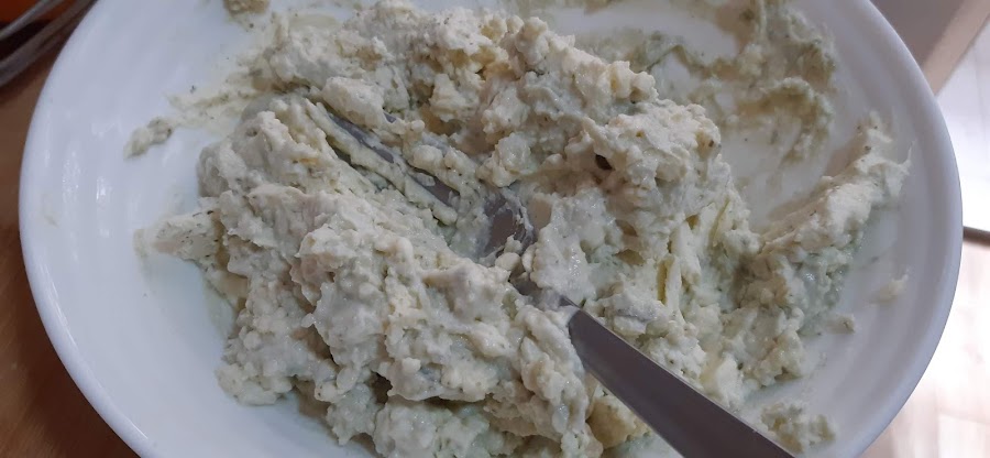 2.- Al sacarlo lo chafamos con un tenedor y vamos añadiendo poco a poco el queso cremoso.