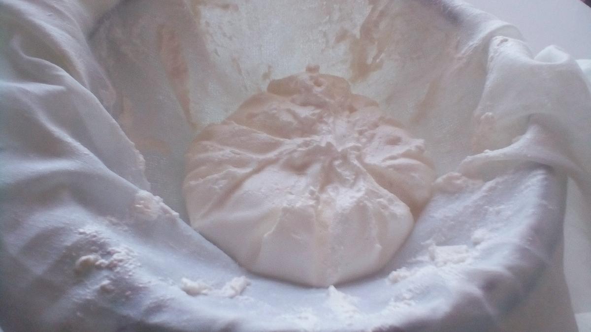 Colocar encima del bol el colador y extender sobre el la gasa, vaciar sobre ella los cuatro yogures, juntar los bordes y con un cordel o elástico cerrar la gasa, taparlo y seguidamente llevar al frigorífico durante 24 horas.
