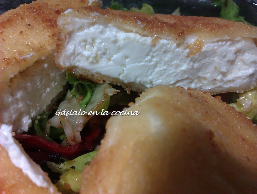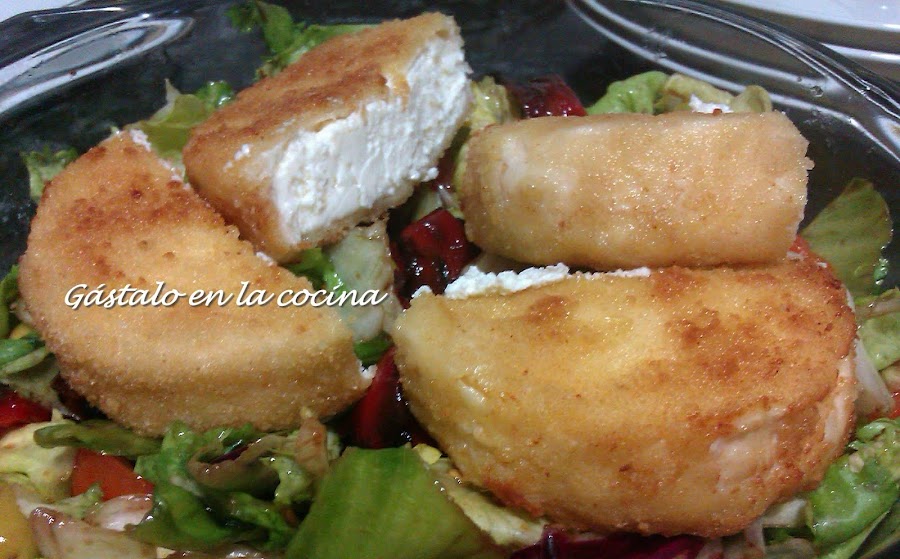 Calentar abundante aceite y cuando esté bien bien caliente y fuerte echamos los trozos de queso lo justo para dorar por cada lado, sacamos sobre papel absorbente.