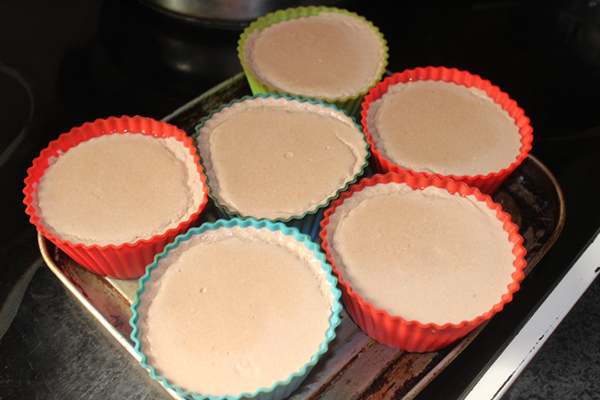 Distribuíel queso-cuajada con colacao entre seis moldes de silicona.