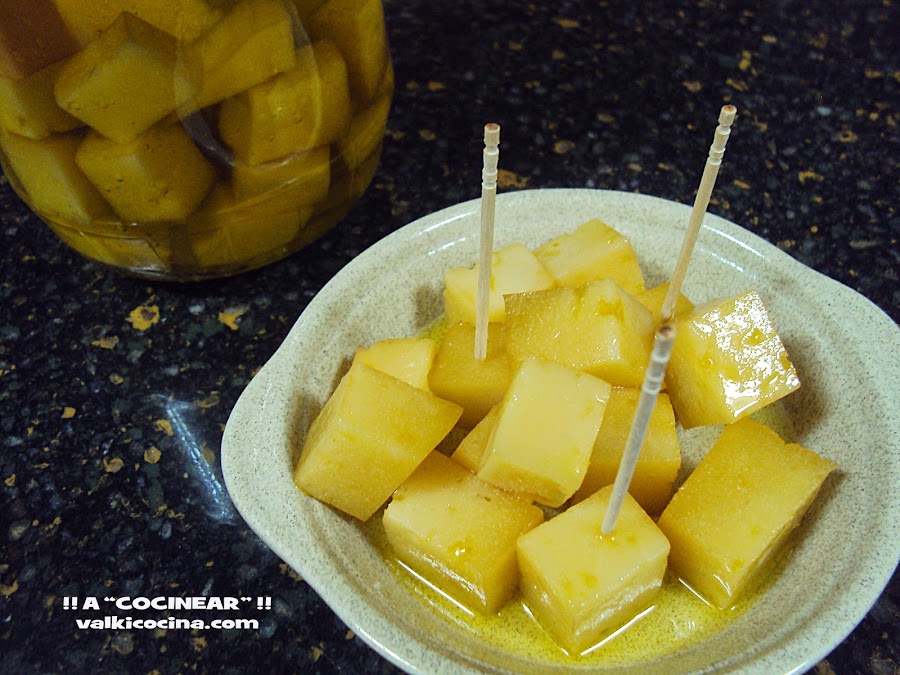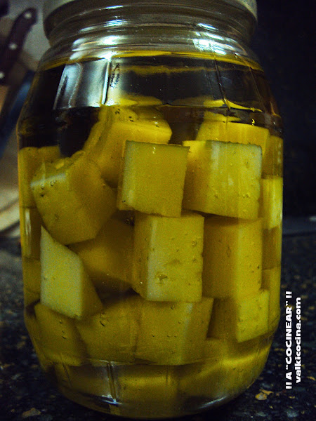 Tradicionalmente los quesos se introducen enteros o en cuñas, en orzas; ... y a nivel más casero troceados en tacos o bastones, que facilita el ir sacándolos según lo vamos consumiendo. Es una buena técnica de conservación para quesos curados.