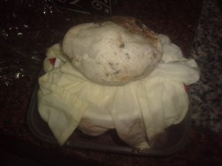 Hecho esto, cerrar la servilleta dejando el queso en el interior, apretando bien con la goma y asi que termine de separarse el suero. Se puede poner un peso encima, yo uso una piedra que tengo para esto.