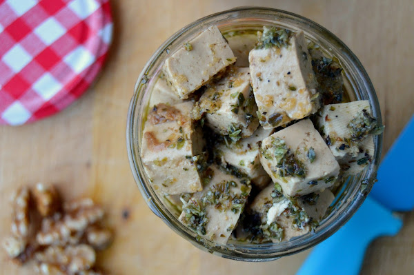 Se le puede sacar mucho partido a la textura carnosa y suave del tofu, como en este caso, para hacer queso feta sin lácteos (sí, he caído, le he llamado queso...): Tofu fermentado con miso y conservado en aceite aromatizado.