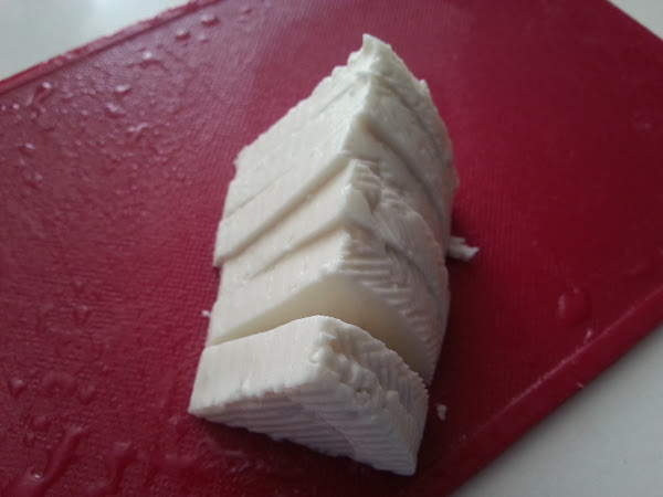 2. - Mientras, cortamos el queso en cuñas y las cuñas ni muy gruesas ni muy finas.