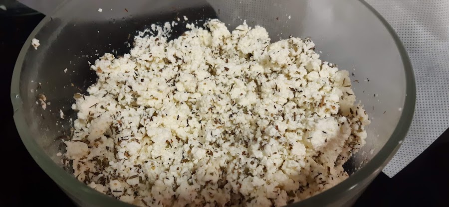 6.- Pasados los 30 minutos, cogeremos con una cuchara e iremos poniendo el queso en un recipiente, donde pondremos la sal y las hierbas. El punto de sal y de las hierbas, es a vuestro gusto pero una cucharada de cada ingrediente, es lo que yo puse. Mezclamos bien con la leche cuajada, todos los ingredientes.