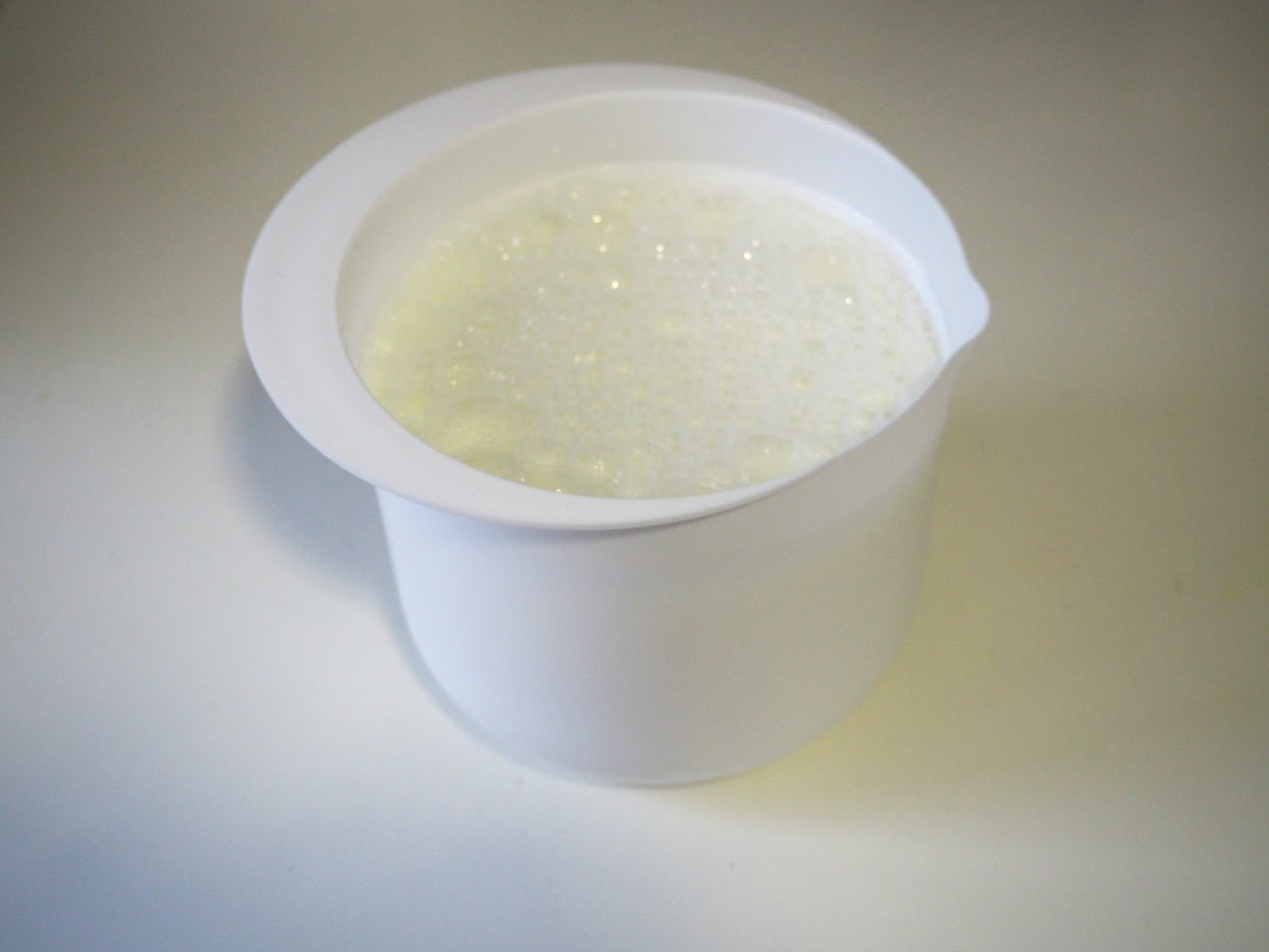 - La receta es para el molde que yo tengo pero también se puede hacer por un cazo (apto para microondas) y una tela limpia de cocina. Empezamos calentando la leche (tapada) en el microondas 13 minutos a potencia máxima (800W). Segúnel microondas que utlicidés necesitaréis más o menos tiempo. También la podéis calentar al fuego. En cualquier caso, es necesario un termómetro de cocina ya que es fundamental que la leche pase de los 90º C. Si no no saldrá bien.