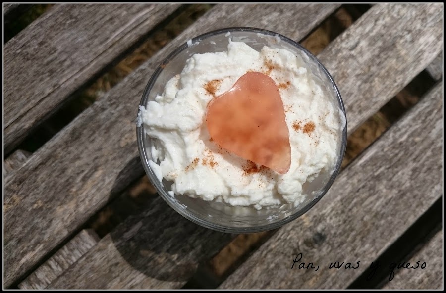 Sacamos los vasos del congelador y echamos una cucharada de queso. Lo aplastamos un poco y encima colocamos un círculo de gelatina. Ponemos otra cucharada y otro círculo de gelatina. Terminamos con una última cucharada de queso y espolvoreamos un poco de canelapor encima.