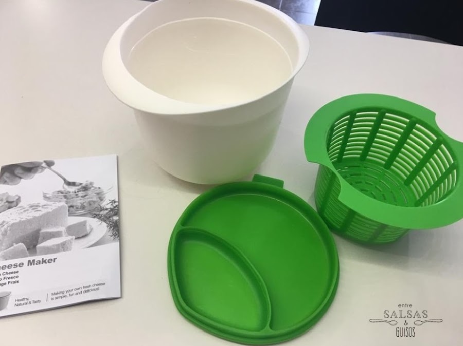 Para empezar me he comprado un nuevo "cachibache", el Cheese Maker de Lékué, aunque si no lo tenéis no pasa nada. Cualquier recipiente que sea apto para microondas (para calentar la leche) y mejor alto (para que no se vierta), y una gasa, como la que usamos para la horchata o un colador de tela de algodón, que nos sirva para estrujarlo muy fuerte y filtrar el suero de la leche, nos sirve.