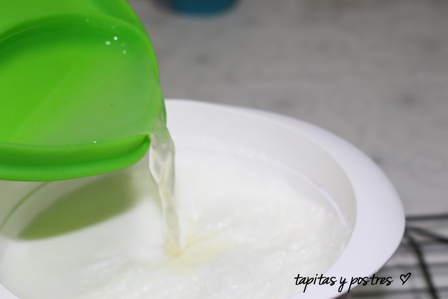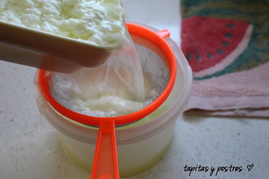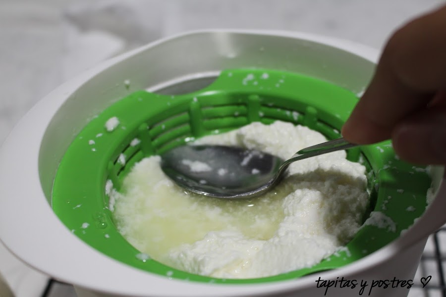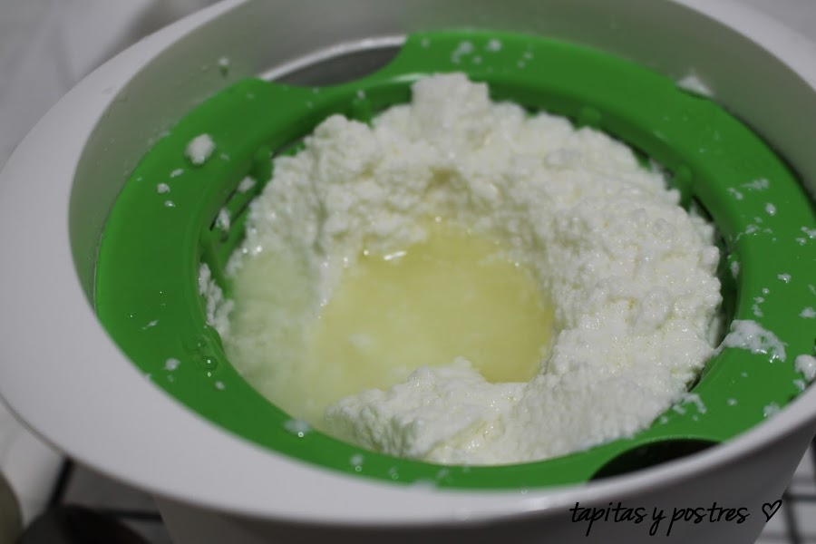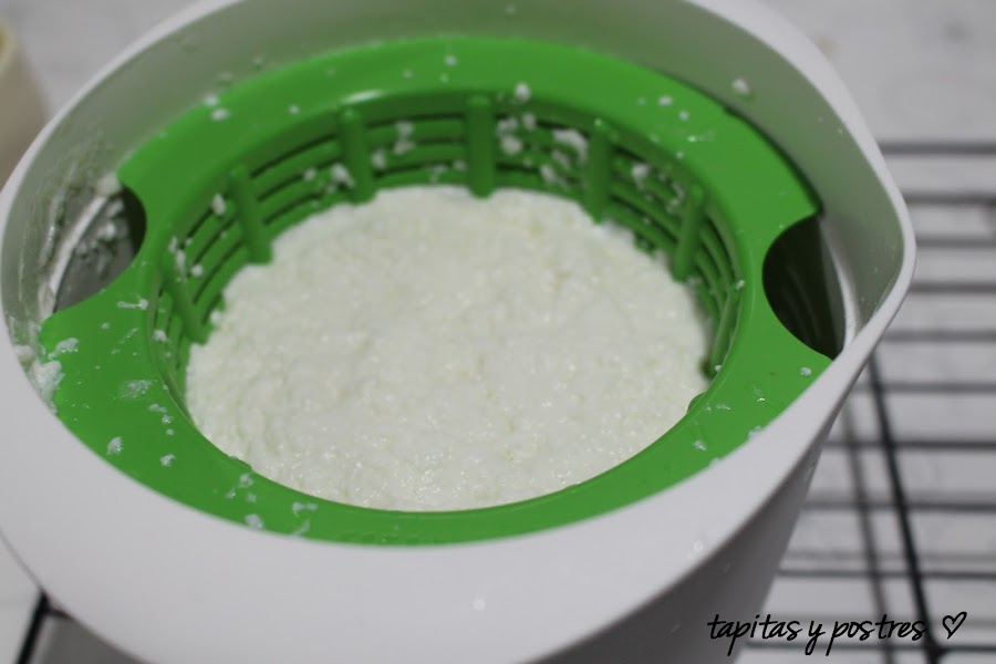 Pasados los 40 minutos de reposo, cogemos un colador grande y encima de un recipiente para recoger el suero que sale, echamos la leche.