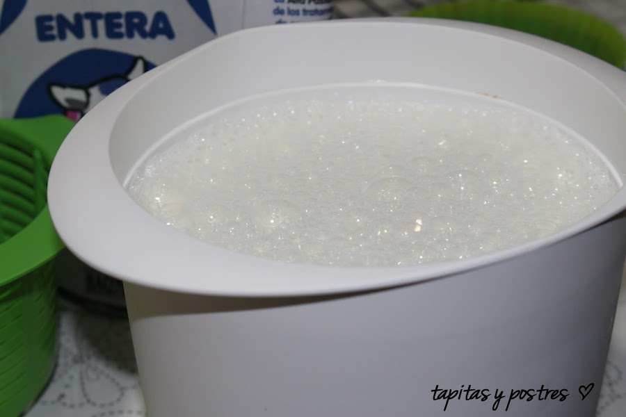 Ponemos la leche en el bol blanco y calentamos en el micro.