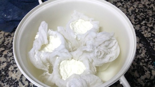 - MOLDEADO: Colamos la cuajada mediante un colador y la colocamos en un molde de rejilla o en una gasa. Yo he puesto las dos cosas.