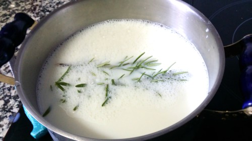 -CALENTAR la leche a 32ºC en una olla. Le he puesto un par de ramitas de romero para que coja el aroma pero no te esfuerces, no se nota el sabor a romero después.
