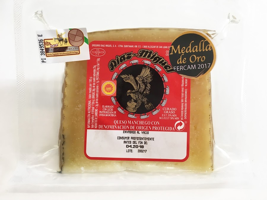 Por eso hoy os vamos a hablar del Queso Manchego Díaz-Miguel DOP curado, que ha ganado recientemente la medalla de oro en la Feria Nacional del Campo en Manzanares (FERCAM), evento que reconoce los ocho quesos manchegos mejores de cada año tras hacer una cata (este año participaron 45 muestras). Su queso manchego curado está elaborado con leche pasteurizada de oveja de pura raza manchega y se fabrica según los requerimientos que marca el "Consejo Regulador de la Denominación de Origen del Queso Manchego".