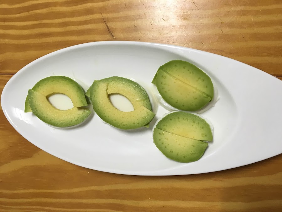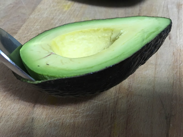 Abrimos el aguacate y con una cuchara, con cuidado de no romper la carne, lo pelamos.