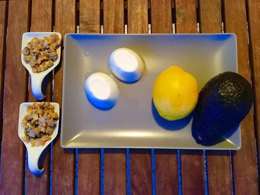 Una vez todo listo simplemente ponemos una cucharadita de berberechos encima de cada composición de queso y aguacate y lo regamos con otra cucharadita de la vinagreta que hemos preparado.