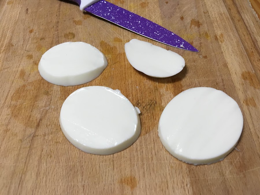 Cortamos unas rodajas de queso fresco y las colocamos en un plato.