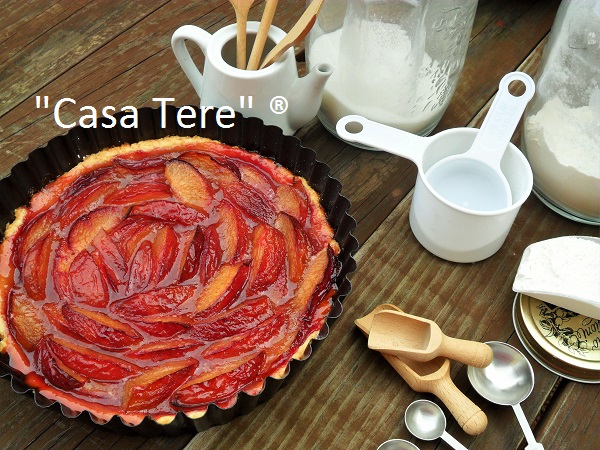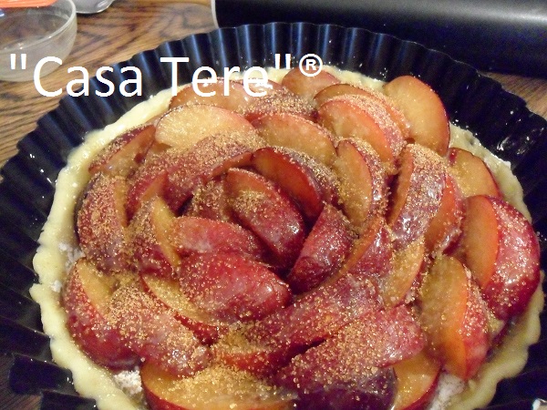 Ponemos a las ciruelas, la canela y el azúcar (no ponerlo antes o soltará un montón de liquido). Removemos y las colocamos como nos guste cubriendo el fondo.