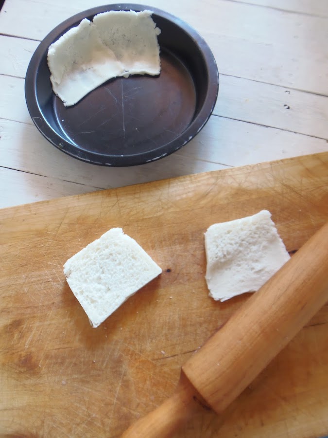 La base con el pan de molde es muy fácil, con la ayuda del rodillo vamos aplastando un poco las rebanadas y las colocamos en la fuente o en los moldes individuales. La metemos al horno 15 minutos o hasta que esté dorada (un poco, que no se queme). Así ya la tendremos lista para rellenar.