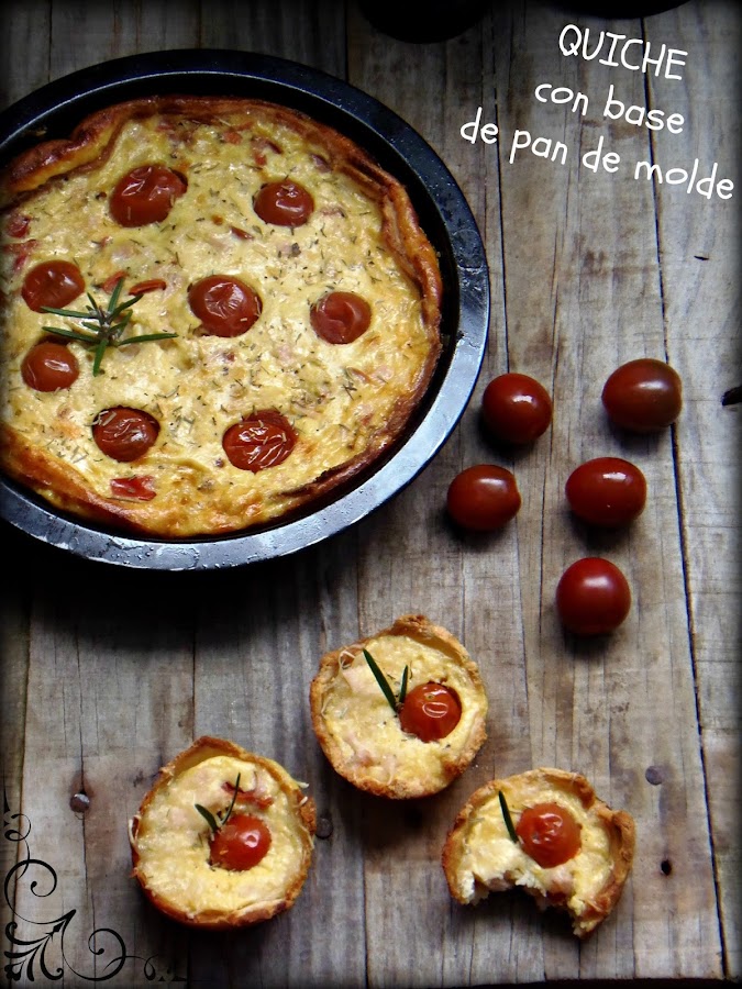 Lo volcamos en la base de pan de molde que teníamos preparada y ponemos los tomates cherry por encima.