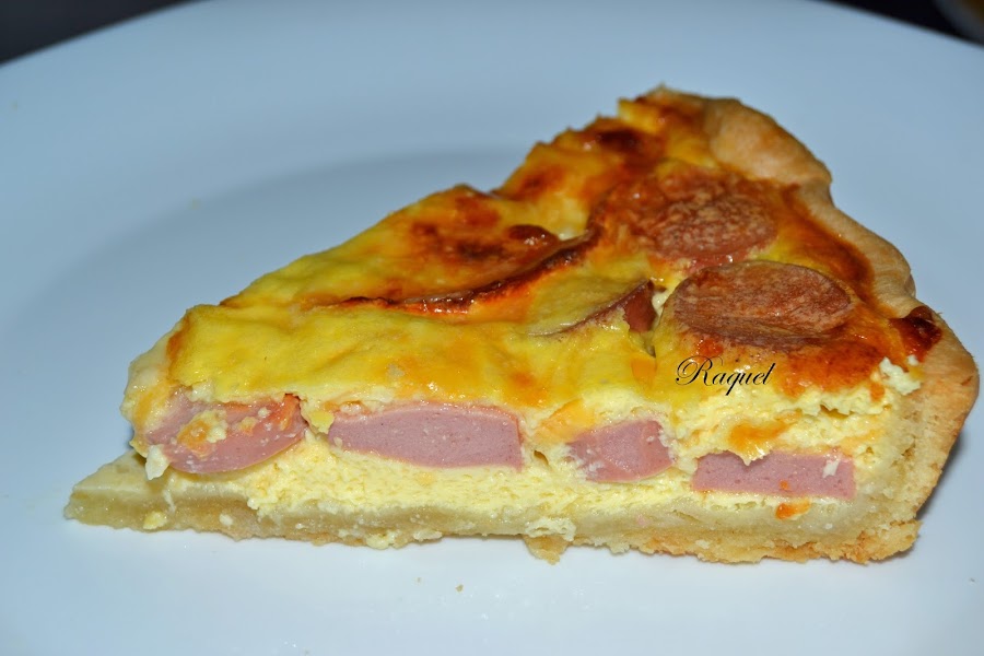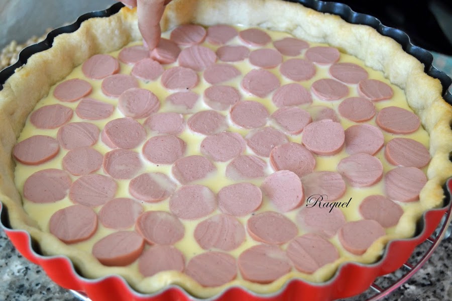 Cortamos a rodajas las salchichas de Frankfurt y las vamos poniendo dentro de la quiche.