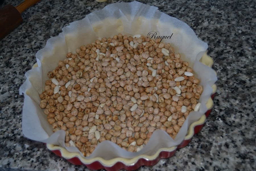 Pinchamos la base de la masa y ponemos por encima un papel vegetal y lo cubrimos de garbanzos o cualquier legumbre seca.