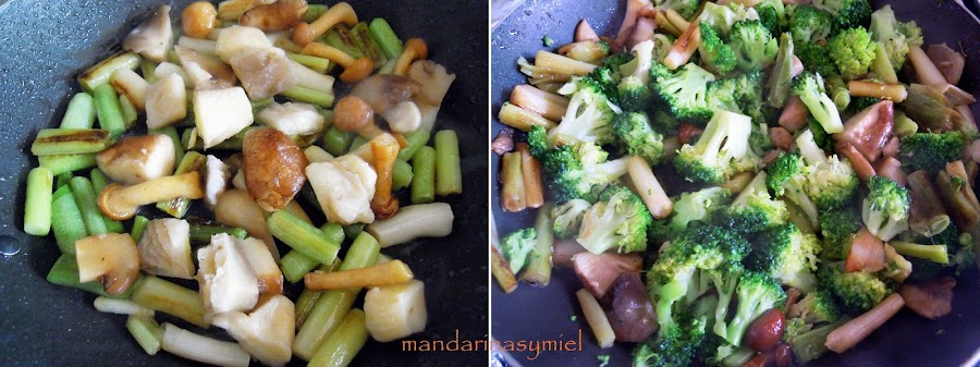 Añade las setas troceadas y el brócoli separado en flores pequeñas, deja que sofría todo junto hasta que esté hecho.