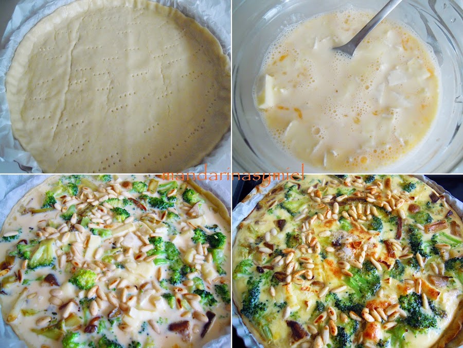 Echa la mezcla de huevos sobre la masa, coloca por encima los piñones y hornea a 160º durante unos 30 minutos, o hasta que veas que está cocido.