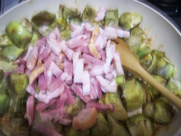 Añadimos el bacón y seguimos rehogando otros 5 minutos más.